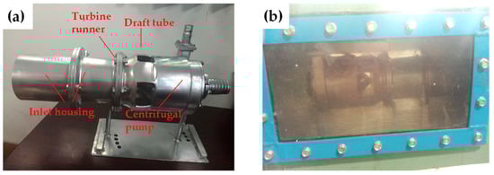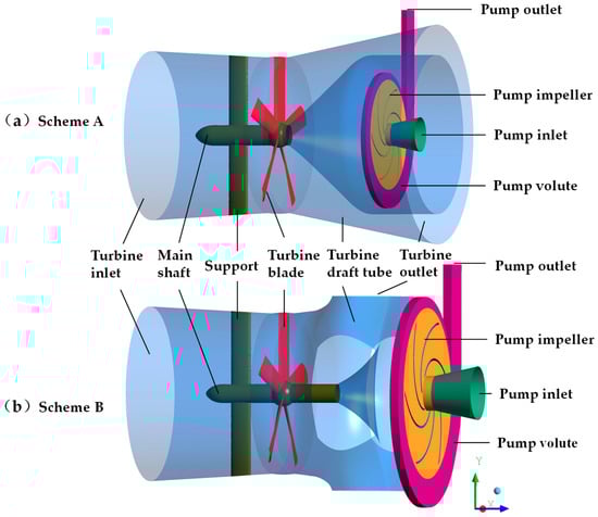 The major parts of the hydrokinetic WTP are the turbine inlet, support, turbine runner, draft tube, hub cover, shaft, pump inlet, pump impeller, and volute. The shaft is arranged in horizontal axis. In general, two schemes of integrating the pump with the turbine on one shaft were considered (Figure 1). In both, the centrifugal pump has an opposite flow direction to the turbine. In Scheme A, the centrifugal pump is arranged in a bulb body inside the straight conical draft tube of the turbine with axial outlet, so that the outflow of the turbine in the draft tube bypasses the pump within the unit. Scheme B [19] has a multiple radial outlet elbow-shaped draft tube, and the centrifugal pump is flanged on from the downstream side, so that the outflow from the turbine bypasses the pump externally of the unit. This has allowed the turbine and the centrifugal pump to share the same unit diameter, increasing the size of the centrifugal pump 1.5 times compared to the considered example of Scheme A.