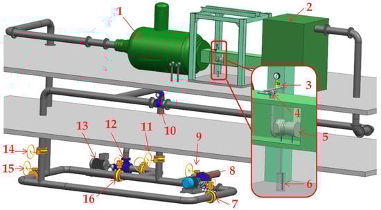 The CAD representation of the test loop: 1—tail water tank, 2—pressure tank, 3—pressure gauge, 4—three-way valve, 5—model hydrokinetic WTP, 6—cylinder, 7—electric valve, 8—variable speed circulating pump, 9—butterfly valve, 10—electromagnetic flow meter, 11—butterfly valve, 12—charging pump, 13—motor, 14—butterfly valve, 15—butterfly valve, and 16—electric valve.