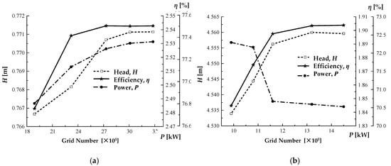 Grid independence curves: (a) turbine condition and (b) pump condition.