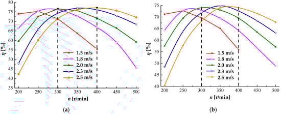 Influences of different rotational speed on efficiency of the water turbine: (a) Scheme A and (b) Scheme B.