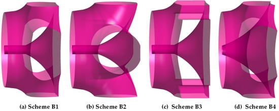 The draft tube is an important component for reaction turbines, where its main function is to convert the kinetic energy of turbine runner outlet flow into pressure energy and recover some of the flow energy. The shape of the draft tube has a vital influence on the operation stability and energy characteristics of the turbine unit, which explains why it should be optimized for the whole unit’s efficient and safe operations. In this part, four different shapes of a multi-elbow draft tube, as illustrated in Figure 7, are tested. Scheme B1 is the preliminary design from Scheme B, while Scheme B4 is obtained based on the modification of internal profile from Scheme B1.
