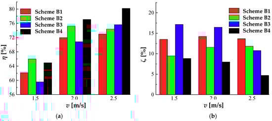 The overall efficiency of the four schemes globally improved with the inlet velocity increase from 1.5 to 2.5 m/s, where, specifically, there was a sharp efficiency increase from 1.5 to 2.0 m/s, and a comparatively slight increase was recorded when the inlet velocity grew from 2.0 to 2.5 m/s (Figure 8a). When (the inlet flow velocity) v = 1.5 m/s, the efficiency of the four schemes ranges between 60.0% and 67.0%.