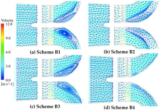 The hydraulic losses in draft tubes of Scheme B2 and Scheme B4 are close and obviously lower than those of the other two schemes, and the efficiency of both schemes are above 65%. The inlet velocity of 2 m/s is similar to that of 1.5 m/s. The efficiency of scheme B4 is the highest, and the draft tube losses are the smallest (Figure 8b). The second one is scheme B2, whereas Scheme B3 is the worst. The major reason for large hydraulic losses is the development of flow vortices and reflux in the draft tube (Figure 9). For v = 2.5 m/s, the performance of Scheme B4 is the best, with over 80.0% efficiency and draft tube hydraulic losses less than 5%, followed by Scheme B3; Scheme B1 is the worst.