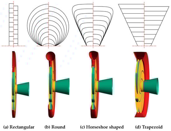 Volute cross-section shape is an important geometric parameter in volute design, and the profile of the volute has a certain effect on the hydraulic performance of the pump. In the initial design, the volute cross-section was rectangular, for its low manufacturing difficulty and cost, but in order to obtain the best performance of centrifugal pump design, four kinds of volute schemes were put forward, namely the rectangular volute, circular volute, trapezoidal volute, and horseshoe volute (Figure 10). The volute throat area kept constant at 6616 mm2, and the design of each cross-section followed the constant circumference rule. Moreover, all other parameters, like volute inlet width, volute outlet pipe diameter, and base circle diameter, were kept constant; only the cross-section shape was changed. In this part, the turbine and the centrifugal pump only shared the same rotational speed, but the two fluids had no contact with each other in space, so their flow states had little influence on each other. However, the total mesh number of the model was more than 3.85 million, in which the turbine model grid number accounts for nearly 70%. With the considerations of the PC’s computing capability and time resources, the pump was only calculated in this optimization.