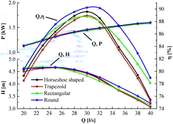 Figure 11 and Figure 12 show the curves of efficiency, pumping lift, shaft power, and relative hydraulic loss rate of volute, with different flow conditions. The efficiency of each of the four volute kinds is more than 80% of the design requirements. At the design point, the round-shaped design exhibited the highest efficiency, while the horseshoe-shaped one was the second highest, which was 0.67% lower than that of the round-shaped design. Pumps with a trapezoid- and rectangular-shaped volute have approximately the same efficiency. The efficiencies of rectangular- and round-shaped volutes are slightly higher than those of the trapezoidal- and horseshoe-shaped volutes, which made the curve become flatter and enlarged the high-efficiency area.