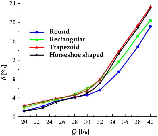 The hydraulic losses of the four volutes keep an upward tendency with the increase of discharge (Figure 12). In small flow rate, the loss of the round and horseshoe-shaped volute is the smallest, followed by the rectangular and trapezoid. The maximum difference occurred at the Q = 20 l/s point, where the loss ratio of the round- and horseshoe-shaped volute is 3.73% lower than that of the trapezoid. The loss rate of the round volute is the lowest, the rectangle one is the highest, and the difference between them is 1.4% at the design point Q = 30 l/s. For large flow rate, the loss of round-shaped design is the minimum, followed by the rectangular one, while the loss rate of both the trapezoidal and horseshoe-shaped volutes is close to the maximum. The largest difference appeared at Q = 35 l/s, where the loss rate of the round-shaped design is 2.2% lower than that of rectangular volute, and about 4% lower than that of trapezoid and horseshoe shapes. Hence, the round-shaped cross-section is accepted as a better scheme when considering the optimal efficiency and minimal losses.