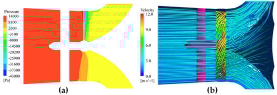 Flow pattern in the WTP at BEP: (a) static pressure distribution in the vertical section of turbine and (b) 3D streamline in the turbine.