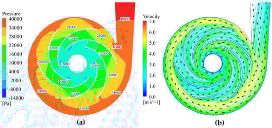 Flow pattern in the WTP at BEP: (a) static pressure distribution in center section of pump and (b) velocity distribution in the center section of pump.