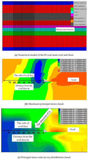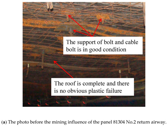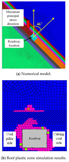 - The expansion of the shallow plastic zone. The coal mining leads to the increase of two principal stresses, the increase of two principal stress ratio and the continuous change of principal stress direction around the surrounding rock of roadway. These will lead to the non-uniform expansion of shallow plastic zone, accompanied by the non-uniform deformation of roof, as shown in Figure 13b and Figure 14b.