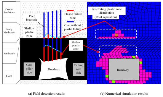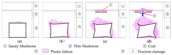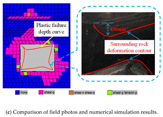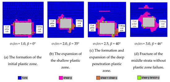 - The formation and expansion of the deep penetration plastic zone. With the further mining of the coal face, the two principal stresses and the directions of the two principal stresses are constantly changing, resulting in the continuous expansion of the plastic zone of the roof and the plastic zone “cross” the median rock layer with higher strength. It forms the penetrating plastic zone preferably in the deep weak rock layer. Meanwhile shallow plastic zone also continues to expand. As shown in Figure 13c and Figure 14c, the destruction of the thin mudstone layer at this stage is the separation phenomenon of the roadway roof.