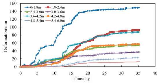 - Fracture of the middle strata without plastic zone failure, and the formation and expansion of the deep penetrating plastic zone. As shown in Figure 13d, with tremendous expansion and deformation pressure, a tremendous compressive load is formed on the middle plastic zone, which results in the normal stress at a point in the lower part of the rock strata without plastic failure exceeds its tensile strength. There will be fracture failure, or even complete instability. The fracture failure in the middle strata generally lags behind the formation of the deep penetrating plastic zone, as shown in Figure 14d. During the period, the surrounding rock of the roadway has severe non-uniformity and large deformation, and the support is extremely difficult. It is required to have a kind of high-strength support material with an anchorage range larger than the depth of the penetrating plastic zone and not broken during the deformation process.