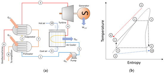 14], which emphasized the work output and exergy analysis, found that a simple cycle with R123 as the working fluid was the optimal design for a low-temperature geothermal resource, with a temperature of 80–95 °C.