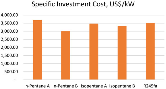 The most economically profitable working fluid in this work was the n-Pentane, obtained with the specific area optimization approach. The system had the lowest specific investment cost of only 3003 US$/kWh and it yielded the highest net present value of US$1,879,224. Its payback period was only 13 years and the internal rate of return was 11.28%. For comparison, based on the thermal efficiency approach, the specific investment cost of the binary system using the same working fluid (n-pentane) was 3689 US$/kWh with a payback period of 17 years, and the internal rate of return was 8.85%. Thus, the result of the area optimization approach reduced the specific investment cost of the system by 687 US$/kWh and it shortened the system payback period by four years.