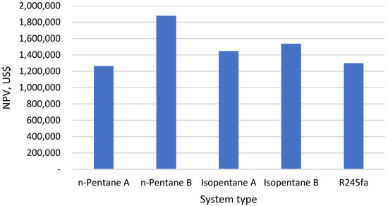 26], the main cost of an ORC system for low to medium temperature heat source comes from the heat exchanger equipment. A profitability assessment was carried out to analyze the net present value (NPV) and the internal rate of return (IRR) to investigate the financial implications. NPV is a better economic measurement when compared to the simpler payback time and return of investment analysis approach, as it gives insight into the time value of money and annual variation in revenues and expenses. The time value of money means that the value of money at the present time is worth more than its value in the future due to its potential earning capacity. In addition, the IRR gives helpful insight to compare the performances of capital investments for different projects, the project’s lifetime, or the actual dominant interest rate. The IRR is also a more suitable method than NPV when comparing projects with very different sizes [