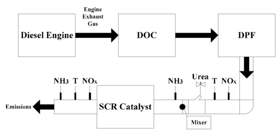 - Chi, J.N.; DaCosta, H.F.M. Modeling and control of a urea-SCR aftertreatmentsystem. SAE Trans. 2005, 114, 449–465. [Google Scholar]