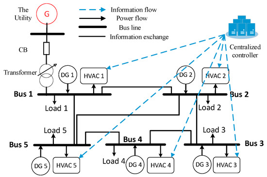 The microgrid system under study is shown in Figure 1, consisting of 5-bus lines. Each bus line can be considered as an individual agent and the information interaction among agents is regarded as a MAS framework. Each bus connects a distributed generator (DG), uncontrollable loads and HVAC units. Circuit breaker (CB) is utilized to realize switching of the microgrid between two operating modes. Centralized controller aims to implement the energy dispatch scheme and assign the related control signal to each HVAC system. Microgrid system operates in an island mode and can be regarded as an autonomous system when disconnected from the utility. When operating in the grid-connected mode, the microgrid enables to trade energy with the utility [26]. In this paper, only the island mode is considered and implemented with the proposed algorithm. In Figure 1, thick solid lines and lines with an arrow represent the local buses and power flow, respectively, while the thin solid lines show the information exchange including operating frequency and power consumption between agents. The blue dotted lines with an arrow represent the reference information, such as the reference power issued by the centralized controller to each HVAC device.