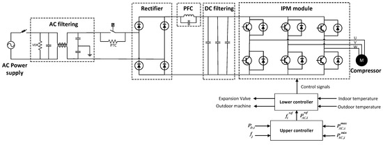 In Figure 2, the power conversion circuit aims to achieve AC-DC-AC, which consists of an AC filtering module, a rectifier, a power factor control (PFC) circuitry, a DC filtering module, and an intelligent power module (IPM). Firstly, a stable DC voltage is obtained by connecting capacitors along with a PFC in the current path after the rectifier. The IPM module is utilized to convert DC to AC regulated by the PWM (pulse width modulation) signals as controlled to drive the compressor. There are two controllers in the HVAC unit. The upper controller implements the distributed algorithm and generates reference frequency and power signals () in response to the local power mismatch () and power constraint of the HVAC unit (, ) and frequency from the neighboring HVAC (). Provided that the indoor and outdoor temperatures, frequency and power reference signals are given, the lower controller then generates PWM pulses to drive the IGBT (insulated-gate bipolar transistor) in the IPM module to ensure the compressor to work under a desirable frequency. Furthermore, the lower controller adjusts the operation state of the expansion valve and outdoor machine to assist its operation.