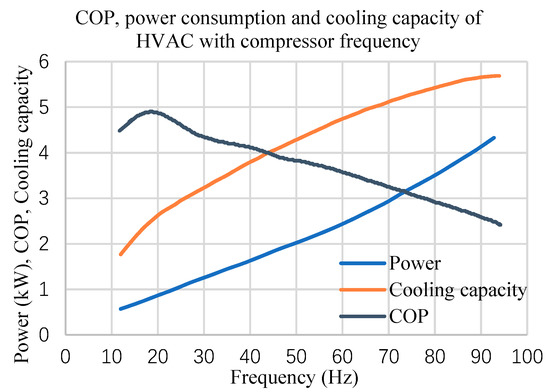 COP, power consumption and cooling capacity of the HVAC against the compressor operating frequency [24].