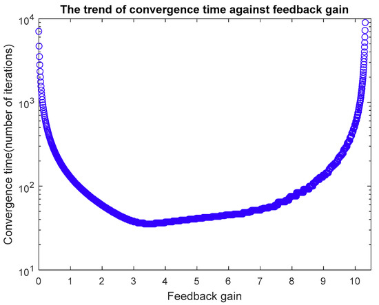 It is worth emphasizing that the state feedback gain is a crucial parameter that dominates the stability and convergence rate of the distributed algorithm. Figure 4 illustrates the change of convergence time with feedback gain under a fixed topology. It can be clearly seen that the convergence time decreases exponentially when . Then, the convergence rate is growing slightly when rises to 9 and the system becomes unstable when . Apparently, the optimal value of lies at the corner point of the curve, which is 3.6 resulting in a fastest consensus time and 35 iterations associated with settling time. Similar trends are also found for the revised algorithm under the time-varying topology.