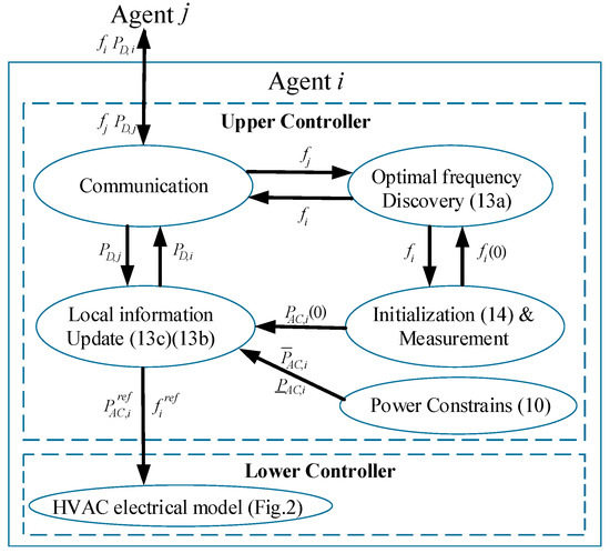 The algorithms are implemented based on the proposed MAS framework. The control scheme for each agent is described in Figure 5. The upper controller determines the desired frequency and calculates the power reference for each HVAC to operate. It is composed of five function blocks. The initialization and measurement block define the initial condition as specified in Equation (18) and specifies the local power mismatch. Power constraint block specifies the operating power range for each HVAC, as indicated in Equation (24). Communication block exchanges information of frequency and the estimated power mismatch with neighboring agents. The optimal frequency discovery block updates its state according to Equation (15). Local information update block calculates the HVAC power consumption and local power mismatch reference signals, as calculated by Equations 16 and 17 and provides them to the lower controller of the HVAC. The lower controller of the HVAC varies its control signal by tracking the frequency and power reference signals, as described in Section 2.