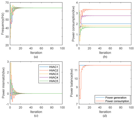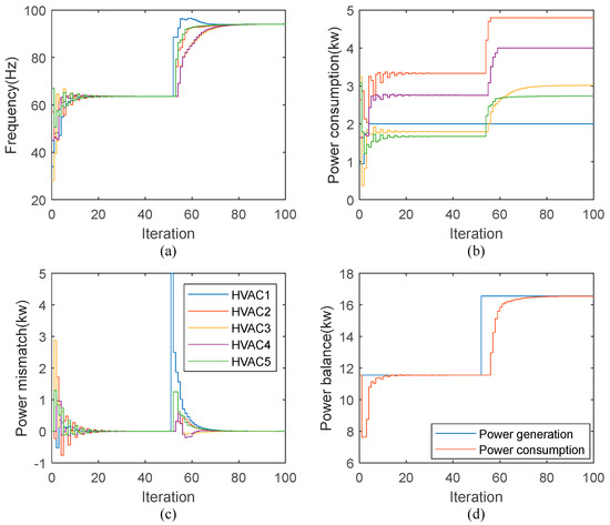 Following results in Case 1, Figure 7 illustrates results for the case considering HVAC power constraint. After 35 iterations, the units converge to a new frequency Hz. The power consumption for each HVAC unit is kW, kW, kW, kW, kW, respectively. Note that the power of HVAC 1 becomes saturated now after 5 iterations and the optimal frequency has a slight increase from 60.2061 Hz to 63.6146 Hz. The unsaturated HVAC units share more power with the growing frequency to compensate the effect of the saturated HVAC device. However, the performance of local power mismatch and power balance for the entire system is not affected, as can be seen from Figure 7c,d.