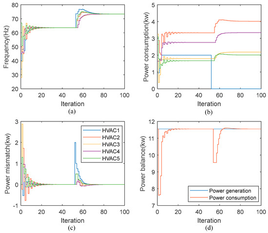 In this case, HVAC breakdown is emulated to assess the robustness of the proposed algorithm. It is assumed that at the 50th iteration, HVAC 1 fails, where a zero power is assigned to HVAC 1 before the next iteration. Thus, we define . The consensus frequency value increases up to 73.37 Hz due to the higher energy share for the remaining four HVACs (Figure 9a). Note that the simulated frequency is specified as a reference value. Practically, the faulty HVAC unit would not be able to operate at the specified frequency. The power consumed is kW, kW, kW, kW, kW (Figure 9b). The performance shows that all power demands to HVAVs are still within their power boundaries. The balance between the total power generation and load demand can still be achieved after the breakdown fault of a HVAC appears.