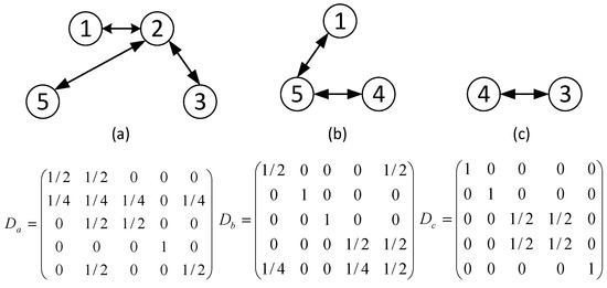 where represents the number of elements in set . It can be seen that matrix associated with a strongly connected graph is a positive doubly stochastic matrix, where the sum of coefficients in rows and columns are both equal to one. Matrix satisfies the following conditions [17,18].
