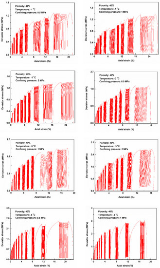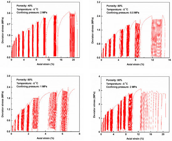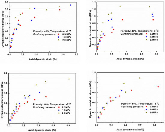 From Figure 3, it is suggested that the overall trend of skeleton curves showed the same form as the stress–strain relationship of hydrate deposits obtained from static triaxial compression experiments. In the initial phase, the shear stress increased rapidly with an increase in axial strain, and the sediments’ deformation exhibited elastic properties. In the yield phase, it could be clearly found that the deformation of the sediment sample included both elastic deformation and plastic deformation. As the axial strain increased, the elastic deformation decreased gradually. With the rise of plastic deformation, the deformation of sediment samples mainly behaved with plastic properties. Under the same strain increment condition, the stress increment in the yield stage was much smaller than that in the quasi-elastic deformation stage. Finally, in the plastic deformation period, the deviator stress increased very slowly with no significant change in the slope of the stress–stain curve; that is, the specimen was still greatly deformed with an extremely small load increment.