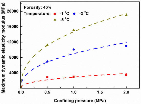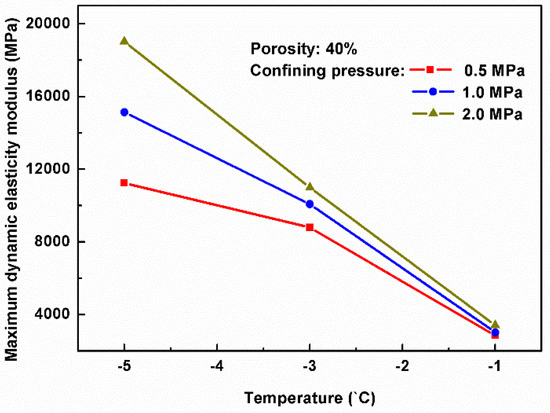 According to these stress–strain curves under dynamic loading, the dynamic elastic modulus of hydrate-bearing sediments was deduced, and the influences of confining pressures, porosities, and temperatures on these values of maximum dynamic elastic modulus were studied. As shown in Figure 4, under various confining pressure conditions, the relationships between the maximum dynamic elastic modulus and temperature were obtained. The results from Figure 4 note that the maximum dynamic elastic modulus tended to be reduced with the rise of temperature, and the decreasing trends of the dynamic elastic modulus were basically consistent with each other under various confining pressure conditions. Compared with this result at the temperature of −5 °C, the confining pressure had no significant effect on the dynamic elastic modulus at the temperature of −1 °C. To sum up, the present study indicated that temperature changes had great effects on the stiffness of hydrate-bearing sediments.