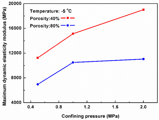 Effects of confining pressures on the maximum dynamic elasticity modulus under different porosities.