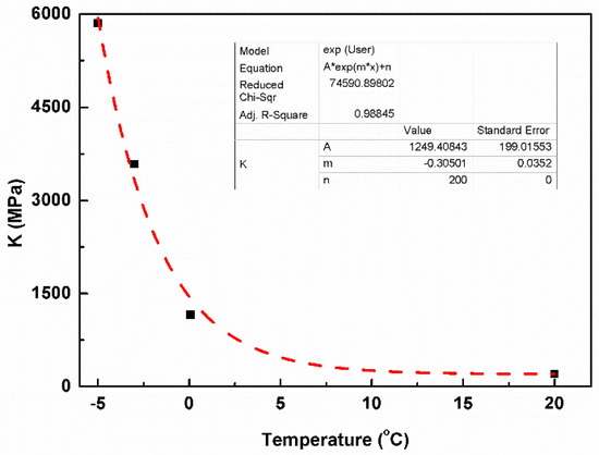 However, the effect of temperature on the parameter K was great. Figure 7 shows the relationship between parameter K and temperature, it was found that parameter K decreased exponentially as the temperature increased. The fitting equation was established as follows: