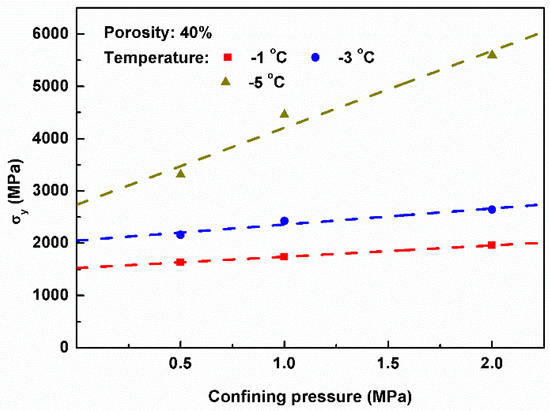 Figure 8 shows the influences of confining pressure σm on the maximum dynamic shear stress σy at different temperatures. It was suggested that there were linear relationships between the two variables, and the corresponding calculation formula was obtained as follows: