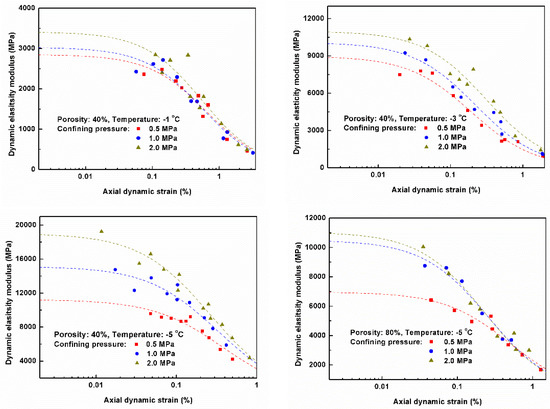 Figure 5 shows the relationships between the maximum dynamic elastic modulus and confining pressures under two conditions of porosity. The graphic results indicate that at the same confining pressure condition, the lower the porosity, the larger the dynamic elastic modulus of hydrate deposits. This might be because, as previous research noted, the strength of sediment samples largely depends on the framework structure of hydrate-bearing sediments [35]. The higher the porosity of natural gas hydrate deposits, the less the soil content within the sediments and the worse the sediment structure. Therefore, the increase in porosity had a negative effect on the sediments’ stiffness. Moreover, the results show that under the lower porosity conditions, the influences of confining pressures on the maximum dynamic elastic modulus of sediment samples were more obvious.