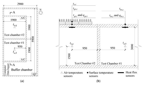 Schematics of the experimental system and measuring points (unit: mm). (a) Plan drawing; (b) A–A cross-section drawing. Here, ta,b: air temperature of the chamber under a bare roof; ta,g: air temperature of the chamber under the green roof; tbr,e and tbr,i: external and internal surface temperatures of the bare roof; ts,e, tgr,e, and tgr,i: external surface temperature of the substrate, external surface temperature of the green roof, and internal surface temperature of the green roof; qbr,i: internal surface heat flux of the bare roof; qgr,i: internal surface heat flux of the green roof.