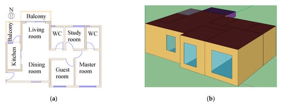 The real building model was a typical top-floor dwelling in Guangzhou. The dwelling had two bedrooms, a study room, a living room, a dining room, a kitchen, and two balconies. Its floor area was approximately 86 m2, and its main facade had a southern orientation, as shown in Figure 3.