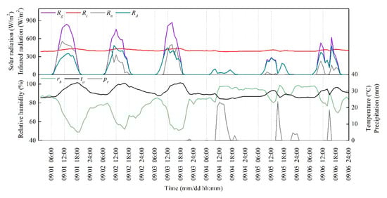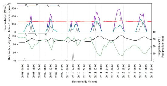 The latter two days of the first measurement stage were rainy days with a total precipitation of 154.9 mm. Solar radiation decreased before the rain, approximately equaling zero during the rain events. The peak global solar radiation on the horizontal surface decreased to 286 W/m2, and the ratio of diffuse radiation to global solar radiation approached 100%, demonstrating that normal direct solar radiation was approximately zero. The infrared radiation on the horizontal surface, outdoor air temperature, relative humidity, and wind velocity fluctuated between 382 and 413 W/m2, 25.2 and 30.5 °C, 80.2% and 98.7%, and 1.1 and 3.6 m/s, respectively.
