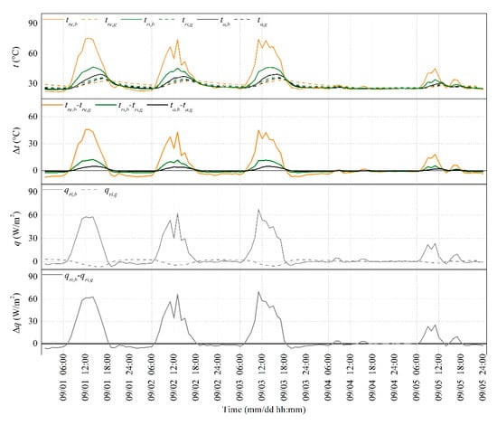 The weather conditions during each measurement stage were subdivided into sunny and rainy days, with the latter defined as days in which any amount of precipitation occurred. The first three days in the first measurement stage were sunny with intense solar radiation, as shown in Figure 4. Taking the results from 1 September as an example, the global solar radiation on the horizontal surface increased from 29.5 W/m2 at 07:00 to its peak value of 842 W/m2 at 13:00. The infrared radiation on the horizontal surface, outdoor air temperature, relative humidity, and wind velocity fluctuated between 386 and 434 W/m2, 26.0 and 35.2 °C, 49.0% and 88.3%, and 0.8 and 3.2 m/s, respectively.