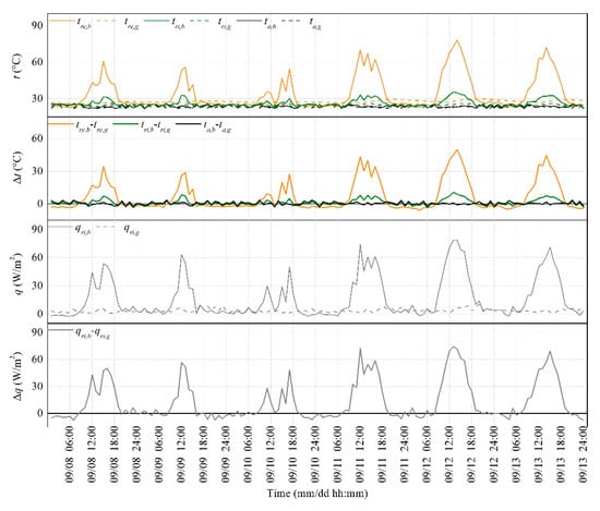 Cooling benefits of the green roof in the non-air-conditioning experimental conditions. tre,b, tri,b, and ta,b: external surface, internal surface, and chamber air temperature of the bare roof, respectively; tre,g, tri,g, and ta,g: external surface, internal surface, and chamber air temperature of the green roof, respectively; qri,b: internal surface heat flux of the bare roof; and qri,g: internal surface heat flux of the green roof.