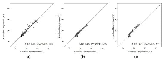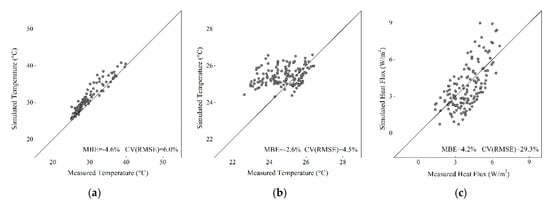 Two error indices, namely the mean bias error (MBE) and the cumulative variation of the root mean square error (CV(RMSE)), were used to evaluate the accuracy of the GRM. The MBE indicates how well the simulation results fit the measured data. Positive values indicate that the simulation results underpredict the measured data. In contrast, negative values indicate that the simulation results overpredict the measured data. The overall uncertainty in the simulation prediction is indicated by the CV(RMSE). This value is always positive, and a low value indicates that the simulation results are close to the measured data. The equations for the MBE and the CV(RMSE) are as follows:
