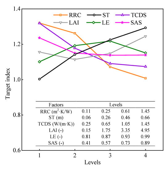 Table 9 shows the range analysis results. DP expresses the significance level of the influence from the factors. Factors with larger DP values had a greater influence on the cooling benefits of the green roof. The maximum DP of the blank rows was 0.079, lower than the DP values of the former six factors (i.e., the RRC, ST, TCDS, LAI, LE, and SAS), which implies that the former six factors were the main factors influencing the cooling benefits of the green roof. The DP values of each factor indicate the order of the factors’ impact: RRC (0.311) > ST (0.29) > TCDS (0.245) > LAI (0.132) > LE (0.116) > SAS (0.099) > blank rows (0.079). The DP of the RRC was the largest among all the factors, implying that the RRC was the most significant factor affecting the cooling benefits of the green roof. The second, third, and sixth most impactful factors were the thermal characteristics of the substrate, while the fourth and fifth most impactful factors were the thermal characteristics of the vegetation, which indicated that the impact of the thermal characteristics of the substrate on the cooling benefit of the green roof was more significant than that of the vegetation.