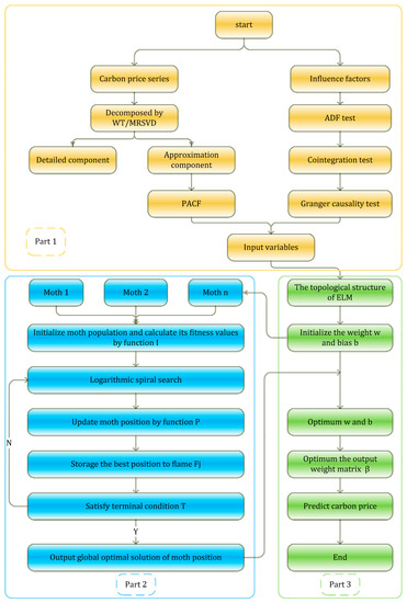 As the carbon trading market at home and abroad matures, the focus on carbon prices is increasing. According to the efficient markets hypothesis (EMH) proposed in 1970 by Eugene Fama, a famous professor at the University of Chicago in the United States, in a stock market with sound laws, good functions, high transparency and full competition, all valuable information is reflected in the stock price trend, which is timely, accurate, and sufficient. Therefore, the carbon price is the core factor for evaluating the effectiveness of the carbon market system. It is not only an important tool for regulating supply and demand but also a key factor in the development of carbon financial derivatives. Accurately predicting carbon prices is critical for policymakers to establish effective and stable carbon pricing mechanisms, which is also important for market participants to avoid investment risks. Carbon price prediction, as one of the issues closely concerned and need to be solved, has become a hot topic of academic circles. Therefore, it is of practical significance to explore and develop a carbon price prediction method with high accuracy. This article is devoted to proposing a new hybrid prediction model based on multi-resolution singular value decomposition (MRSVD) and the extreme learning machine (ELM) optimized by moth–flame optimization (MFO) considering both internal factors (historical carbon price data) and external factors (energy and economic factors) for the analysis and prediction of carbon price. Compared with traditional statistical models, it has superior learning ability, which can grasp the non-linear characteristics of the carbon price series. Compared with the classical intelligent algorithm, it can avoid the defects of a single algorithm and predict the future change in carbon price with more accurate fitting. Therefore, the research in this paper has certain academic significance and application value.