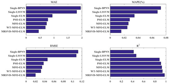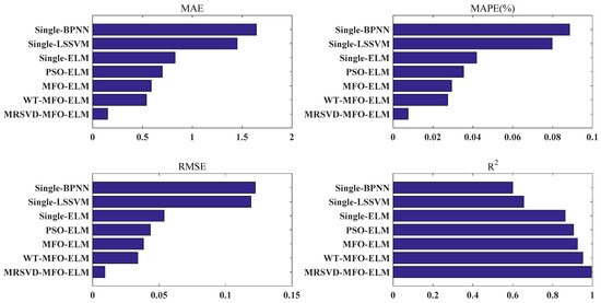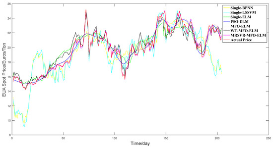 (b) Compared with WT-MFO-ELM, MFO-ELM, PSO-ELM, single ELM, single LSSVM, and single BPNN, the MRSVD-MFO-ELM model shows a clear strength in carbon price prediction results.