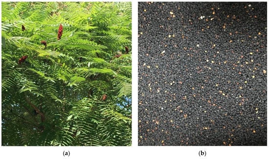 The R. typhina seeds were collected from the wild/wasteland in Tianjin Binhai New Area, China. The seeds were separated by hand, washed with distilled water, and then dried in the sunlight first for 48 h and then at 60 °C oven-dried (to remove the moisture) until the seeds reached an unchanged weight. A grinder (XIANTAOPAI XTP-10000A, Zhejiang, China) was used to grind the seeds. The ground seeds were oven-dried at 60 °C for 1 h and 30 min to finish the moisture and then extracted to obtain the oil. Photographs of plants and seeds processing are shown in Figures S1 and S2 (Supplementary Materials).