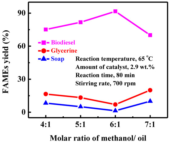 Methanol to oil molar ratio is one of the main factors affecting the ester conversion during the transesterification process. The transesterification of RT oil was evaluated and investigated at different methanol to oil range. The added amount of methanol in the reaction was varied from 4:1, 5:1, 6:1, and 7:1 (as shown in Figure 3). While temperature (65 °C), stirring intensity (700 rpm), and reaction time (60 min) was kept constant. The best proportion of methanol and oil was 6:1, in which the conversion yield was 91.66%. But at proportion 7:1, the conversion percentage was as low as to 70%. It was observed that when the proportion of methanol to oil rises from 4:1–6:1, the product yield was increased. Whereas in an additional increasing proportion of methanol to oil, a reduction in biodiesel production was observed. Excessive methanol can make it difficult to separate glycerol from the biodiesel phase. The higher methanol ratio restricts the separation of glycerol due to high solubility. Thus, in the presence of residual glycerol in the biodiesel layer allows the equilibrium reaction to start the backward reaction and again met with the methyl ester to form a monoglyceride [27]. The results show that excessive use of methanol has no substantial effect on biodiesel production; in fact, the separation of ester and glycerol is complicated. Therefore, a molar ratio of 6:1 is the optimum ratio of RT methyl ester yield.