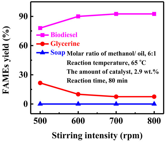 Stirring is a key factor in the optimizations because it affects biodiesel production in both ways. In the KOH and methanol mixture, the fat and oil are not soluble, so in the transesterification process, the mixing is very important. The decomposition of methanol was carried out at various agitation speeds, i.e., 500, 600, 700, and 800 rpm. While the methanol to oil molar ratio (6:1), KOH concentration (2.9 wt.%), reaction temperature (65 °C), and reaction time (60 min) was kept constant. The FAMEs production at diverse mixing speed is shown in Figure 6. The reaction was witnessed to be incomplete at 500 rpm, and the mixing rate was not significant for methanol decomposition. The yields of the methyl esters at 600 and 700 rpm were 90% and 92.5%, respectively. As clarified by the results, a direct correlation was elucidated between the agitation rate and the RTOME yield, i.e., as the agitation rate increased, an increase in yield was observed. Therefore, a mixing rate of 700 rpm provides the best conversion rate (92.5%) of RT oil to RTOME. This is consistent with the previous studies [31,32,33], which concluded that increasing the agitation rate promotes the homogenization of the reactants, resulting in higher methyl ester yields. Once the two phases are mixed, and the reaction is started, stirring is no longer needed. It is clear from the results that a further stirring rate (800 rpm) has no significant effect on RTOMEs yield, but the result was the same as 700 rpm (95.5%).