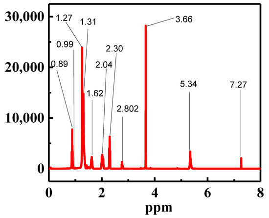 The biodiesel yield during the transesterification process was determined by using 1H NMR techniques, and the progression of its characteristic spectra was depicted. When 1H NMR was used, the produce methyl ester was used to monitor the product by the protons of the methylene group adjacent to the ester moiety in the TAG and the protons of the alcohol moiety. Though by 1H NMR spectroscopy technique, the RT seed oil biodiesel was characterized, the spectra of which are shown in Figure 8 and Table S3 (Supplementary Materials). The distinguishing proton methyl ester peaks were detected to be a singlet at 3.663 and triplet of the α-CH2 proton at 2.308 ppm correspondingly. The existence of methyl ester in biodiesel was approved by these two distinctive peaks. At 0.895 ppm, the peaks were detected to be terminal methyl proton; at 1.319 ppm, the associated methylene protons of the carbon chain were detected, which shows a strong confirmation. A strong signal was detected for the β-carbonyl methylene proton at 1.623 ppm and olefin hydrogen at 5.342 ppm, respectively. According to the literature review, several studies specified that this diverse standardization curve established on 1H NMR spectroscopy was used to enumerate the reaction yield throughout biodiesel production by transesterification of a mixture of methanol and fatty acids [36,37,38,39]. In this regard, the 1H NMR spectrum of RT oil biodiesel can be used to quantify the conversion of triglycerides to methyl esters during transesterification, as evidenced by previous studies [40,41]. In this study of 1H NMR spectra, the divers and distinctive analyses were existing in the Rhus typhina seed oil biodiesel methyl ester spectrum. The appropriate indications selected for incorporation are the methoxy group of the methyl ester at 3.66 ppm and the methyl ester group of the α-carbonyl methylene proton at 2.308 ppm. Thus, 1H NMR spectroscopy showed a strong conversion of TAG to Rhus typhina methyl ester.