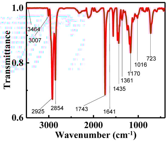 To identify the various stretching and bending vibration corresponding functional groups and bands of the pure RT seed oil biodiesel sample, the FTIR spectra mid-infrared regions were used. The FT-IR carbonyl group position is highly sensitive to both molecular structure and substituent effects [43]. The two strong characteristic ester absorption bands which are derived from a carbonyl group are vC=O at 1750–1730 cm−1 and C-O at 1300–1000 cm−1. At 2980–2950, 2950–2850, and 3050–3000 cm−1, respectively, the stretching vibrations of CH3, CH2, and CH appear, and at 1475–1350, 1350–1150, and 723 (ρCH2) cm−1 respectively the bending vibrations of these groups appear [44]. As presented in Figure 10 and Table S5 (Supplementary Materials), at 1743 cm−1, the Rhus typhina seed oil biodiesel methoxy ester carbonyl group has appeared. The peak 3464 cm−1 indicated an overtone of the ester function [45]. The C-O stretching vibration exhibited two asymmetric coupling vibrations at 1170 cm due to O-C-C and 1016 cm−1 due to νC-C(=O)-O. The stretching bands of methylene appeared at 2854 cm−1, and methane appeared at 3007, 2925 correspondingly. The bending vibration appeared at 1435, and 1361 cm−1 belong to the methyl group, and the bending vibration appeared at 723 cm−1 belongs to the methylene group. The peak at 1641 cm−1 shows that C=C is not saturated in RT seed oil biodiesel. It is worth noting that the chromatography and spectroscopy techniques can be used to assess biodiesel, making observing, and its superiority. GC-MS, IR, 1H NMR, and 13C NMR was in the FAME-determined features, and different functional group structure is considered to be effective, fast, and easy to use techniques. Therefore, they are used for precise facts elucidation in biodiesel is sensible and dependable.