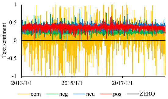 Daily text sentiment. Notes: “com” indicates , “neg” indicates , “neu” represents , “pos” indicates , “ZERO” refers to zero line.