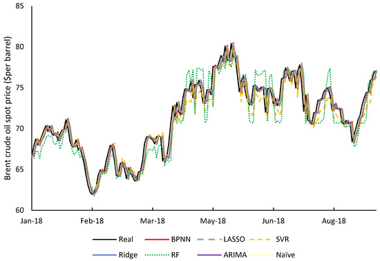 There are many oil price prediction models which can mine different kinds of information from oil price from different perspectives. Before we begin to analyze the relationship, we choose a model that can better explain the relationship between oil price and text sentiment, evaluating this by forecasting performance. According to the introduction in Section 2.3, we select Ridge, Lasso, SVR, BPNN, and RF for testing. Since there are hyperparameters in each algorithm, manually adjustments are unavoidable. After more than 2000 attempts, the best results are selected for comparison and analysis. As for the text features, we choose which expresses the comprehensive sentiment of the article as the text sentiment feature.
