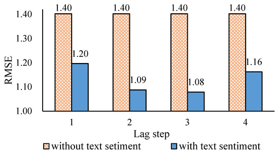 Comparison of RMSE without, and with, text sentiment and different lag steps.